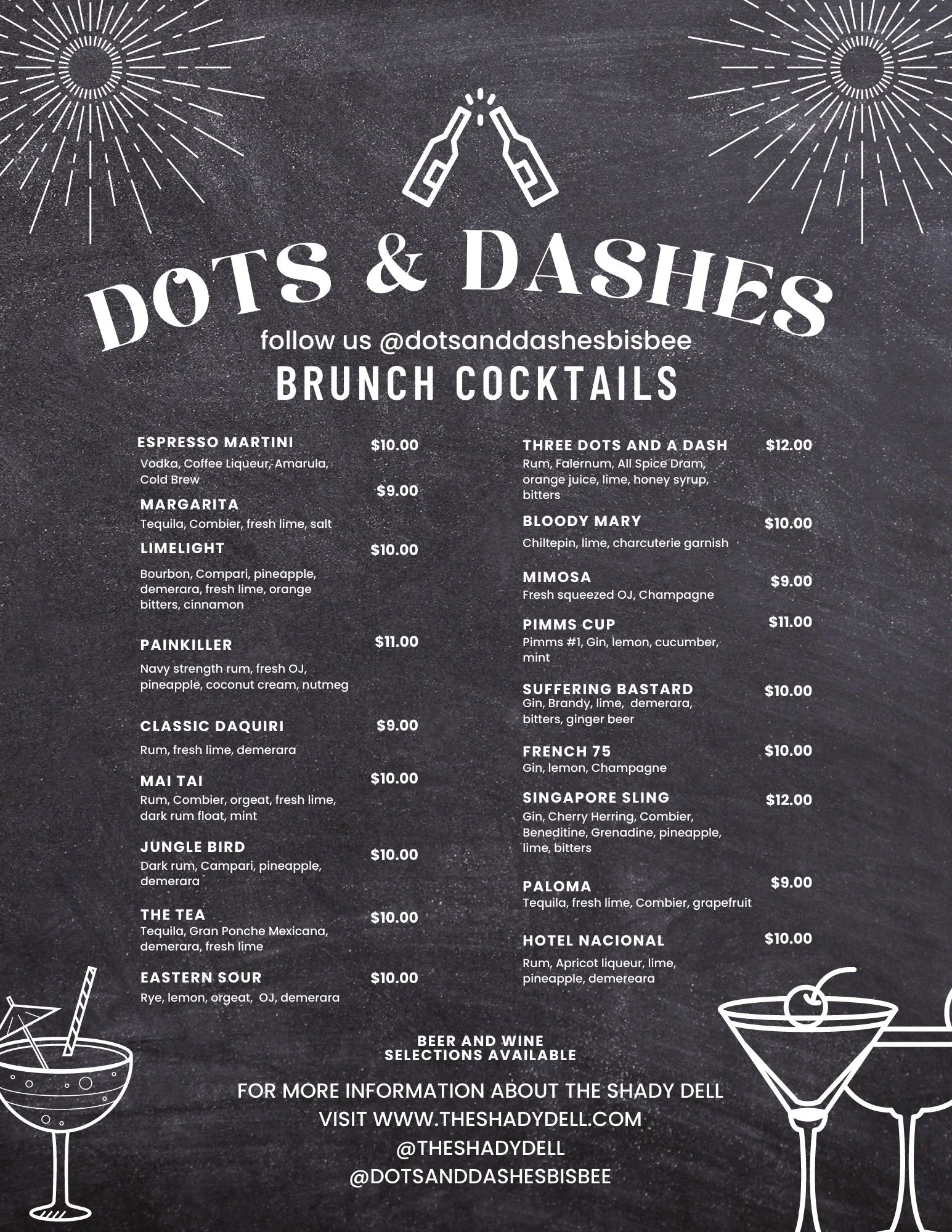 Welcome to our 1955 Airstream Trailer Bar located right in the middle of the Shady Dell next to Dot’s DIner. We serve classic cocktails, tiki inspired cocktails, beer and wine for our guests and the general public on the weekends.